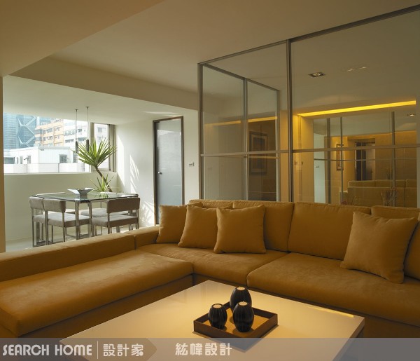 客餐廳與相鄰書房採用大量的玻璃材質來增加穿透感。玻璃餐桌搭配鐵件腳增添利落現代感,暖色調的燈光及橘色沙發選配,則是應用互補對比概念鋪陳,中和餐廳及書房的冷調,整體氛圍顯得年輕卻不凌亂。