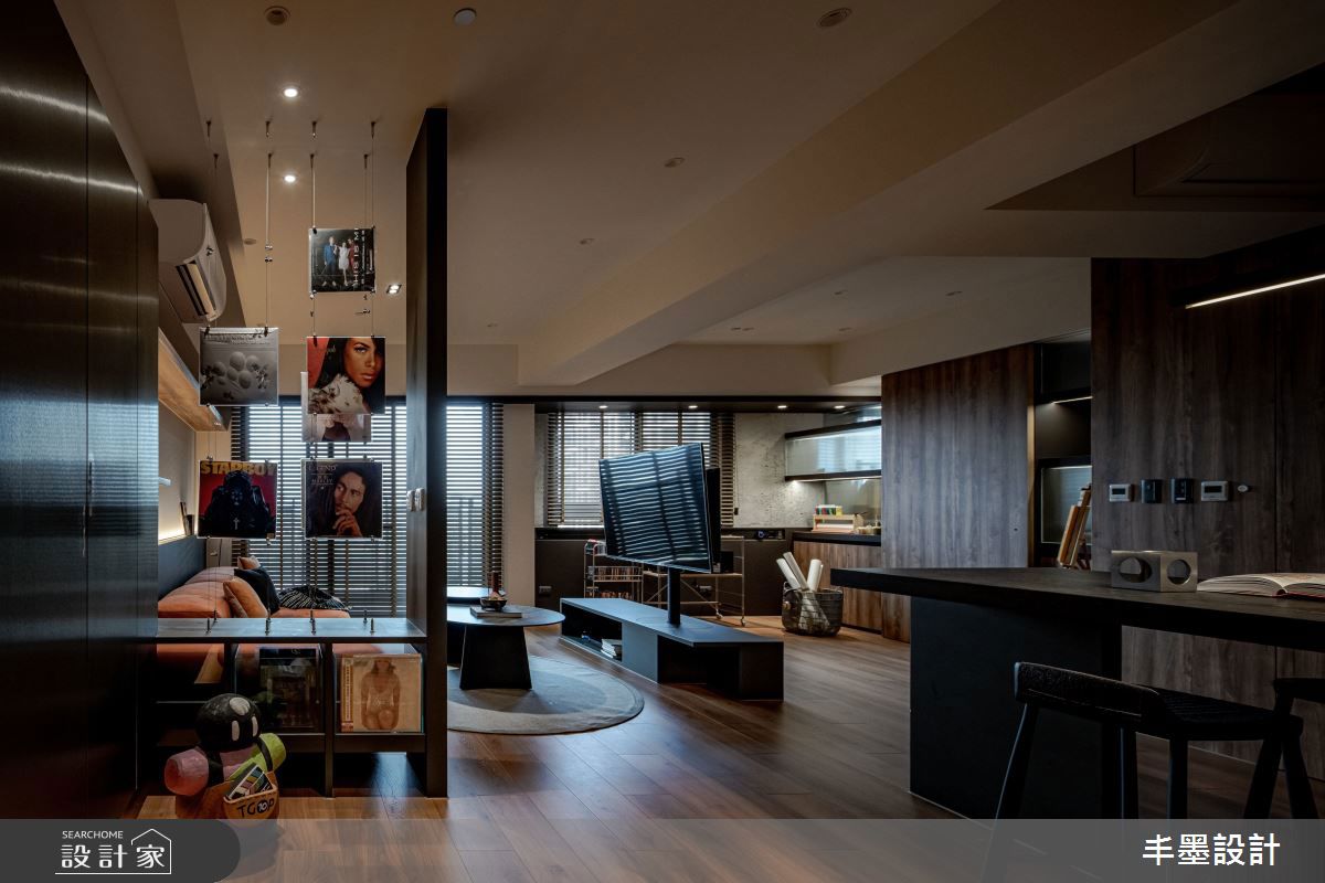 這是一個專為跳躍思緒Youtuber雙胞胎兄弟檔,哥哥展榮的新家,與弟弟展瑞分別住樓上樓下,同樣的坪數但是格局與設計卻大不同,有別於弟弟的清新無印風格,哥哥展瑞的居家色調以沈穩的木質混搭工業風格。格局上並非制式住宅框架,而是一座隨心轉動的萬花筒。玄關以沉穩的深灰色與胡桃木紋為基調,塊狀的木紋收納櫃與俐落的深灰線條,構築出安定而有層次的視覺感。從玄關的毛絲不鏽鋼櫃體,引導動線至客廳的懸浮唱片牆,再自然延伸至餐廳大中島,讓空間在視覺上流動、串聯,作為萬花筒「鏡筒」看向室內變化多端的設計。
