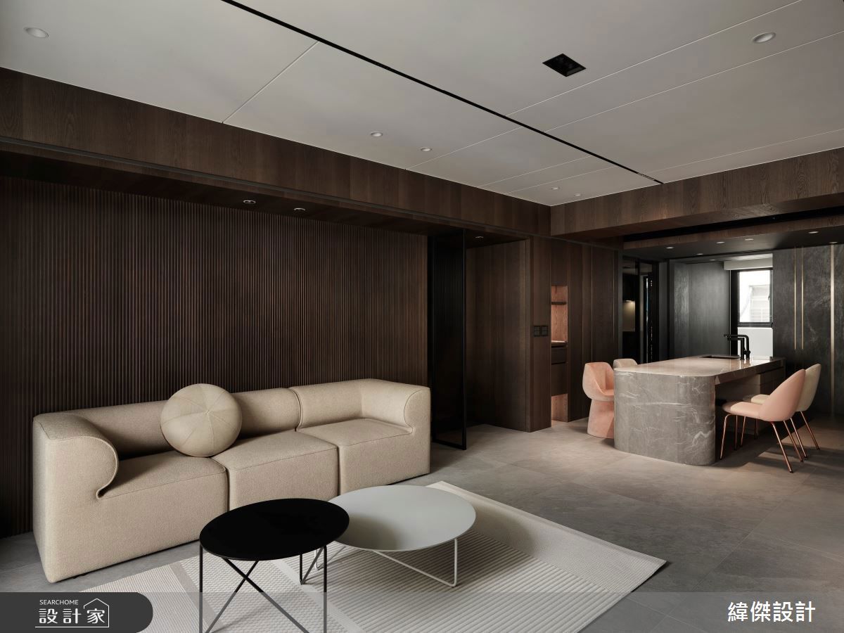 開放式的公領域設計,讓原本狹長的格局展現出寬敞感。設計師以實木皮包覆橫亙的樑柱,並呼應牆面的深咖啡色調,營造出和諧一致的氛圍,再搭配燈條的間接光源,使視覺更具層次;優雅高級的畫燈映照在奢石壁面上,將空間格局與質感推升至宛若展覽館般的精緻;沙發背牆則以風琴牆的形式呈現,增添簡約俐落的氛圍。順著動線來到用餐區,長形中島兼具餐桌功能,其邊角以圓潤的弧形修飾,讓石紋檯面消弭了銳利感,多了幾分柔和。餐廚空間依屋主夫妻的使用習慣,區分為內外廚;一字型的廚房動線簡潔俐落,乾淨而高效,再加上出入口的玻璃拉門,不僅有效阻隔油煙,也能引入充足採光,讓小家庭的日常更顯舒適自在。