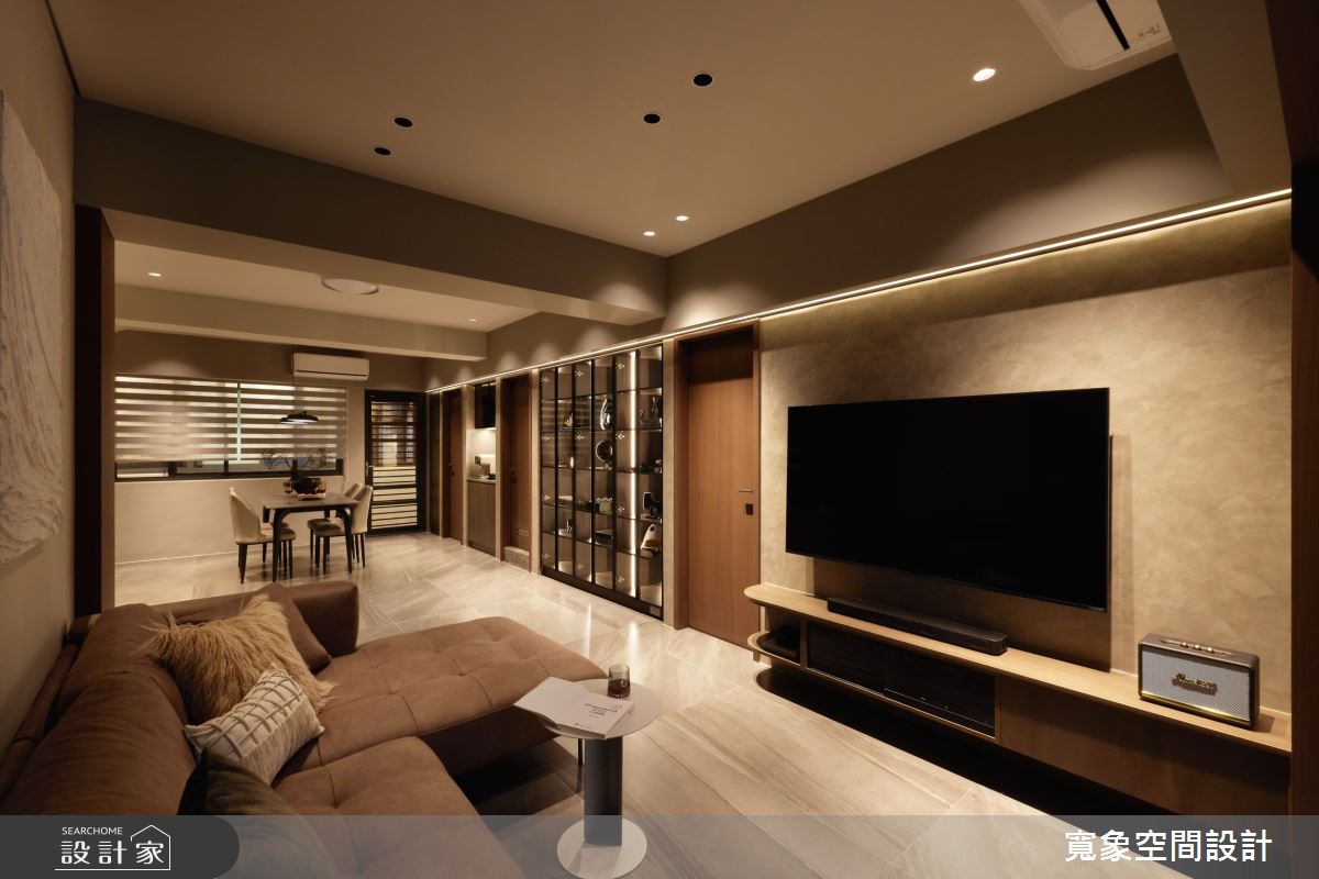 玄關與公領域以異材質的地坪鋪陳,並貼心規劃穿鞋椅與傘架,讓入門動線更便利舒心。走進公領域,客廳與餐廚區則以開放式設計串聯,營造開闊通透的生活場景;地坪皆以相同材質的大板磚鋪陳,不僅維持一致的風格調性,也帶來低調而優雅的現代韻味。設計師以灰色漆面修飾樑柱,在開放式空間中自然劃分區域,使分界清晰卻不顯突兀。沿牆延伸的燈條與收納立面,自客廳一路銜接至餐廳,成為視覺焦點,也串起兩個場域的連續性;展示櫃體則結合玻璃門片,內部配置層板嵌燈與間接光源,散發出精品般的立體感與精緻度。