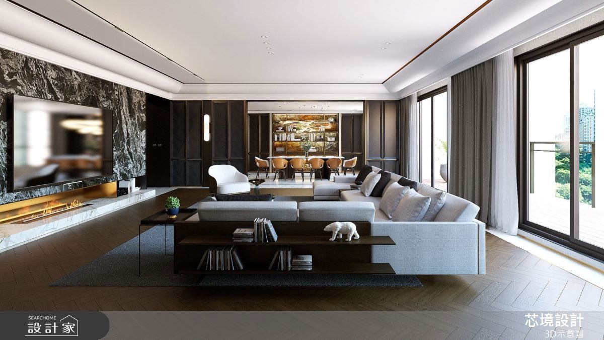 為了將空間高度最大化,設計師將客廳區天花板造型簡化,藉由弧形設計的銜接層次,使視覺得以延伸,擴大空間的高度視感。電視牆採用黑白紋理交織的石材,挹注磅礡大器的藝術風範,結合人字木地板、鍍鈦細節,更展現精緻優雅的工藝美學。