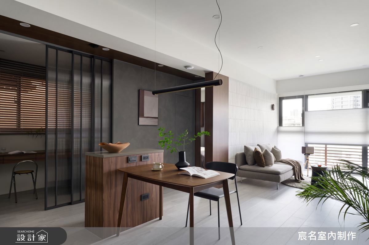 玄關以深色地坪圍塑,鞋櫃結合展示櫃,並以灰玻打造全身鏡,打造機能十足的玄關落塵區,開放式空間串聯客廳及中島餐廳,日光由大面落地窗進駐,照亮空間,公領域以白色及灰色藝術塗料,穿插溫潤木質,烘托靜謐的氛圍,客廳電視牆旁的書牆注入人文氣息,弧形收邊增加圓潤柔和的感受,沙發後方的背牆,以白色地鐵磚鋪陳,突顯其立體層次,塑造獨特的居家端景,餐廳區加入中島,型塑回字型動線,符合多元生活場景使用,餐邊櫃立面也採用白色地鐵磚,與客廳牆面相呼應,整體感一致,擺放烤箱、茶具等,成為日常備餐與享用輕食的完美角落。書房以鋁框烤漆玻璃門區隔,視覺上創造了輕盈感,同時也界定了空間的屬性,書房既能保有穿透性,又能確保機能的獨立性,木質開放式層架,在燈光的映照下,讓收藏品更顯精緻,在木質長桌閱讀或辦公,抬起頭日光透著木百葉,光影與層架交織的溫暖氛圍中,擁抱專屬的寧靜時刻。