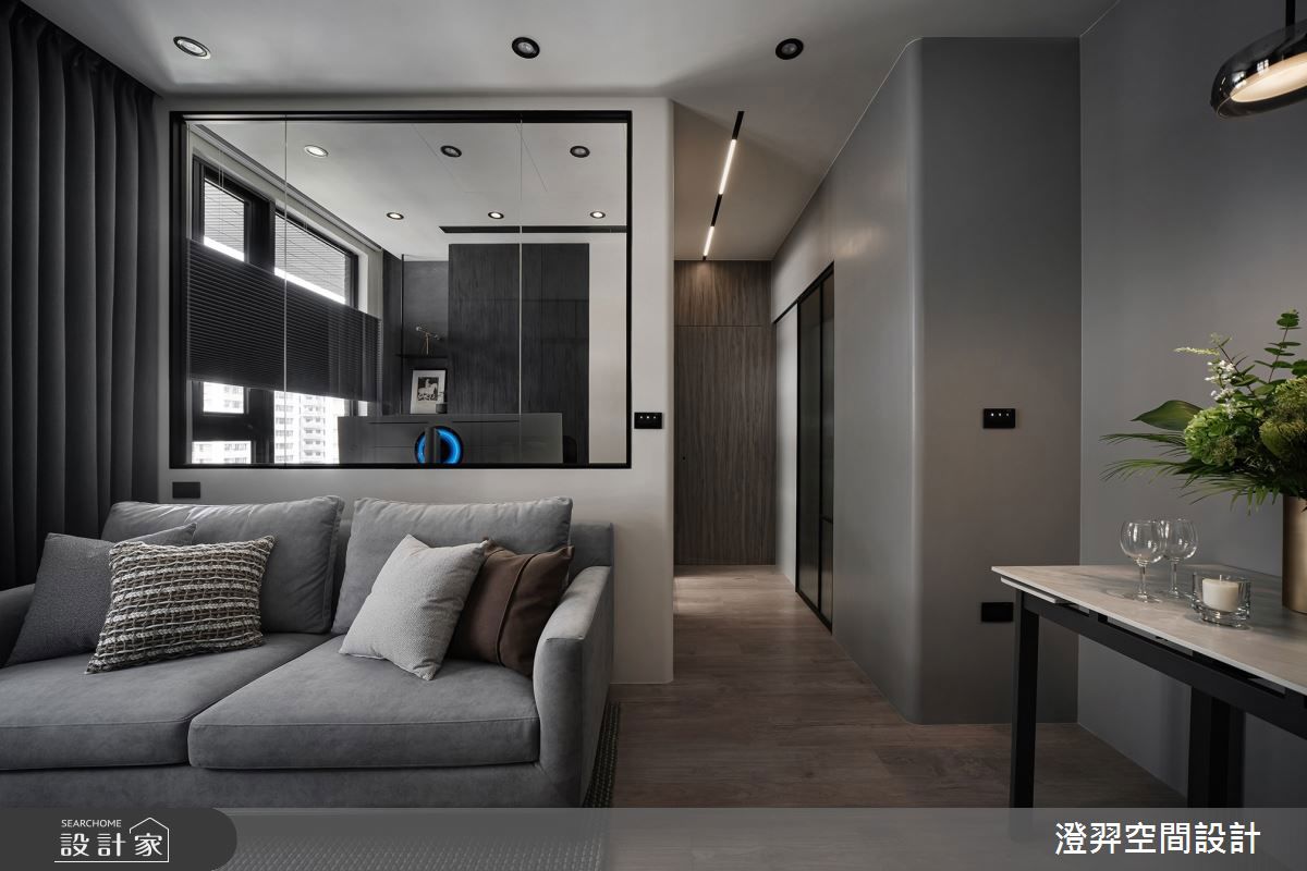 落塵區依照樑柱結構,規劃整面的嵌入式玄關櫃,提供了充足的收納空間;玄關底端利用隱藏門設計,規劃出一個儲物空間,讓屋主能收納風扇、行李箱等大型物品。沿著天花板的弧形語彙引導入開放式廳區,視覺面向偌大的採光窗;天花板利用弧形包樑搭配嵌入式燈帶,線型分佈簡約俐落;黑色紗簾與遮光布簾的窗層設計,能自由調節光線,呈現出能感知時節變換、具有情境感的居住空間。恰到好處的弧形語彙與隱形設計為核心理念,電視主牆在窗邊做了半弧設計,整體空間尺度更為優雅延伸;選用灰色的spiver藝術塗料鋪敘立面,呼應整體黑灰色調風格。主牆特色格柵造型,將入口隱藏了起來,搭配上懸浮式電視櫃造型更顯輕盈,簡約而不簡單的細膩設計刻畫單身宅識別。一旁的牆面預先留了插座,擺放一張輕盈的方形餐桌,上方懸掛一盞金屬吊燈,光線以暈散方式灑落下來,呈現出與客廳不一樣的情境,宛如一個特別預留給屋主的專屬空間。沙發後方的房間特別將局部改為玻璃帷幕,入口是霧面玻璃拉門,讓光線能相互穿透照亮走道,也消弭了隔間造成的視覺隔閡、但保有一定的隱私性。多功能書房以沈穩的木質系統板訂製書桌與造型收納櫃,窗邊還預留空間規劃休憩臥榻,安裝風琴簾能自由調節光線與躺臥時的視角;特別訂製大尺度臥榻也可以作為客房使用,坪數雖小但是機能卻超越想像。