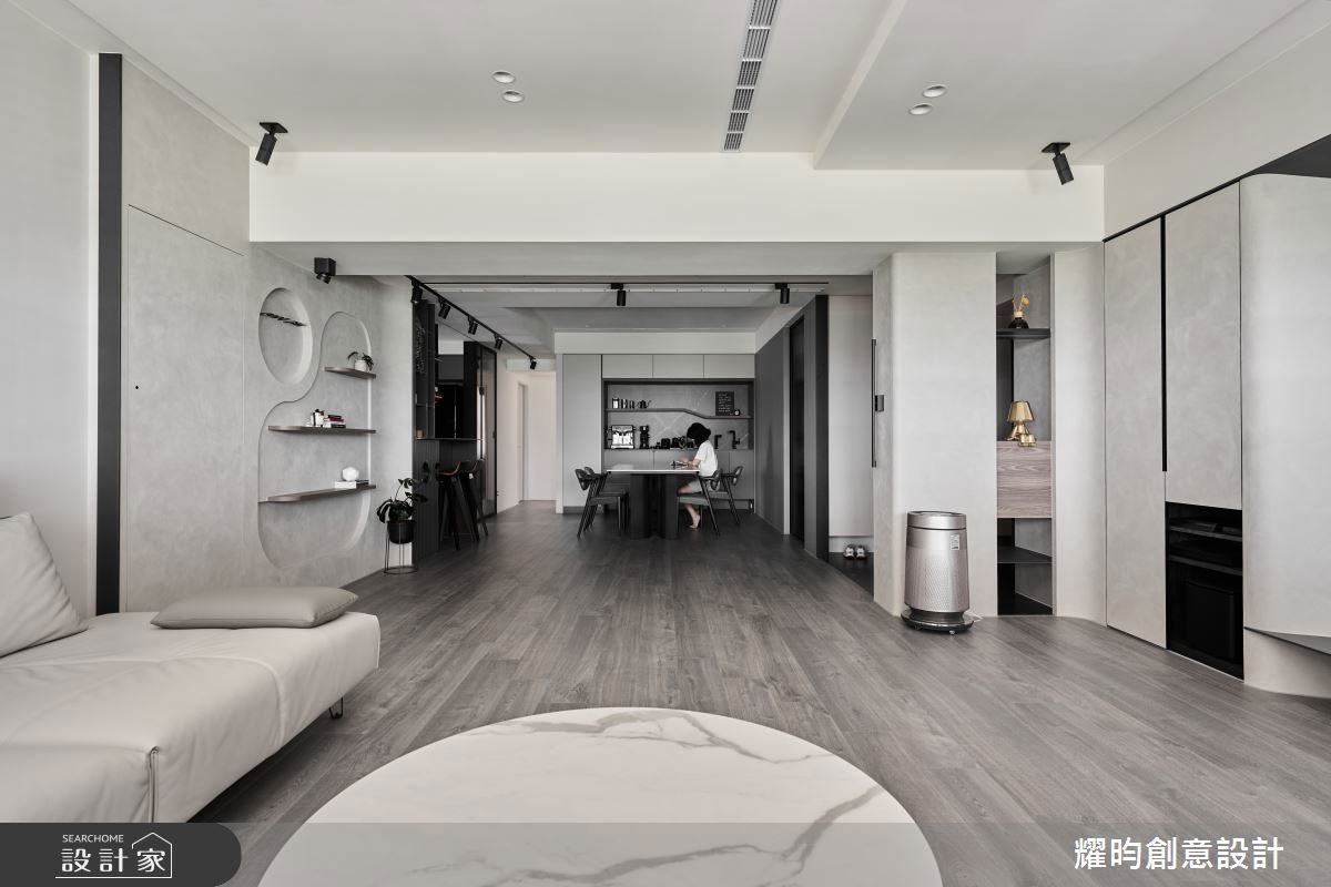 客廳空間擁有優越的採光,設計師為了風格整體性加裝了白色百葉窗,讓合併後的格局更顯開闊與風格一致。天花板以全平面方式處理,讓燈源、吊隱式空調等等呈現俐落簡約的狀態;地板選用深色超耐磨木地板,鋪貼方式更凸顯了空間縱深。電視主牆採用嵌入式設計,和玄關櫃做整體規劃;側邊機櫃透過弧形設計帶出電視主牆,黑色薄金屬層板與塗料的對比,以簡約設計創造摩登主視覺,保留寬敞的客廳空間讓屋主能自由移動家具,打造多元化機能的生活場域。