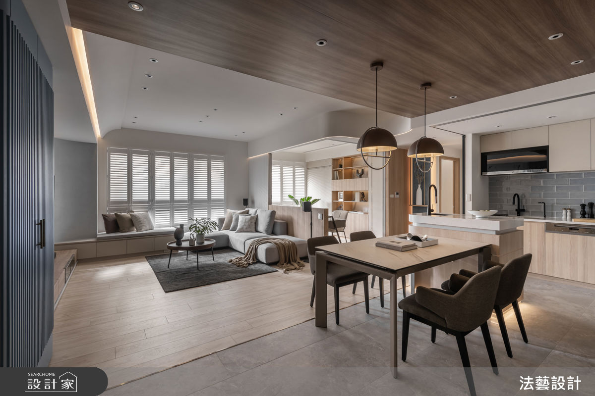 原本低矮的樑柱,是許多住宅的設計痛點。法藝設計團隊巧妙運用弧形天花板結合燈帶,將結構問題化為美學語彙,當夜晚燈光柔亮漫開,原先的缺陷反而成了空間中最迷人的亮點。