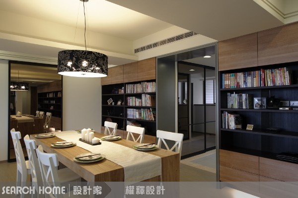 設計師以兩面造型對稱的書牆來規劃餐廳空間的牆面,不但讓空間中的收納機能更為完備,同時也豐富了視覺效果,而對稱的線條感亦有拉長整體結構的視覺效果,讓格局感覺更為開闊。