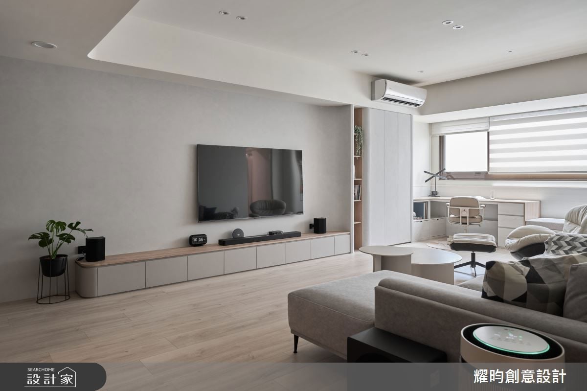客廳空間拆除了於本的電視半牆,改以簡約的淺灰塗料鋪敘牆面延伸空間尺度;與收納櫃的銜接方式,依照櫃體深度做了一個曲面設計,創造順接的視覺體驗;落地電視櫃與側邊收納櫃雖然都是系統板材,但是有著細膩的弧形收邊與材質銜接,呈現出更高的空間質感。櫃體牆體化的設計概念,順暢的平面化設計突顯空間的景深;異材質的組合在比例上拿捏得宜,在沒有調整格局的狀況下達到最好的設計效果。