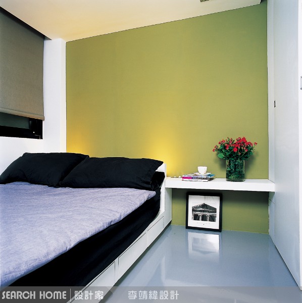 不需要太多繁複的裝飾,一面顏色漂亮的牆面就能讓臥房空間超有設計感!由於臥室空間較小,設計師僅安排了基本的床具與造型簡約的床頭小桌,而以活潑清爽的蘋綠色調來帶出設計感,讓空間乾淨簡單而不單調。
