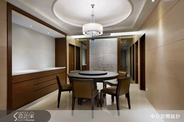 由於建商原本配置的餐廳格局稍嫌狹小,而其餘房間格局的規劃又過於零碎,因此設計師將其中一間房間取消,將其空間分別配至主臥與餐廳空間,而本案餐廳側邊的餐櫃便是運用此空間打造而成,不但實用且造型大方,呼應了整體設計感。