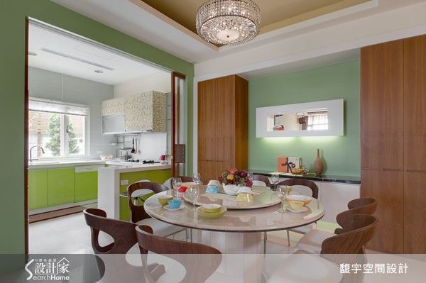 設計師利用拉門設計讓廚房在沒有下廚時,門片能隱藏在牆面中,構成完全敞開式的空間,與餐廳構成一個共同的區域。當主人在下廚備餐時,家人或者來訪客人也可以一起參與互動。