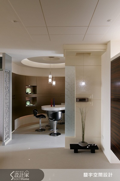 延續客廳空間特別增設吧台區,僅用簡單的鏤空雕花屏風區隔,讓喜歡招持客人的屋主有更多空間可以靈活運用。