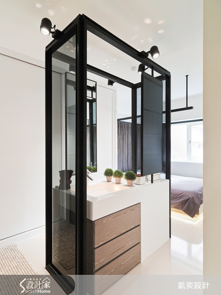 臥室裡藏有最振奮人心的雙面式盥洗台設計,以雙邊對向使用,拉近了人與人最親密的互動,鐵件框架與軌道燈成為臥房區域的主要光源,如地景般座落成裝置藝術,是屋主最拍手叫好的一項設計。