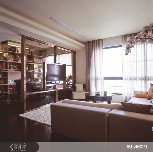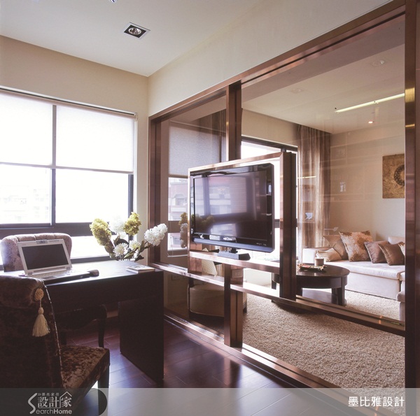 書房與客廳之間藉由半穿透的概念設計,原有的隔間牆拆除後,以茶色玻璃以及不鏽鋼鍍玫瑰金色的方是作為隔間,同時也是客廳的電視牆,中間的電視可自由旋轉,讓屋主不論在書房或客廳都可以享有視聽功能。