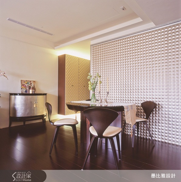 在空間的整體調性上,可以看到全室沉穩而又帶質感的展現,無論是上了金銀漆的裝飾板或是鍍了玫瑰金顏色的結構,閃耀的質感搭配內斂的黑檀木地坪都訴說著居住者獨特的品味。在本案中,可以看到設計師將設計還原成以呈現空間的本質,讓空間成為生活的最佳容器。