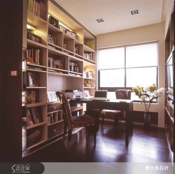 設計師在規劃時,屋主參與頗多,像是書房的書櫃靈感就是來自於屋主去日月潭的五星級飯店居住時而來。設計師藉由不同比例切割的手法,讓櫃體看來更加活潑,也成為空間的視覺焦點。