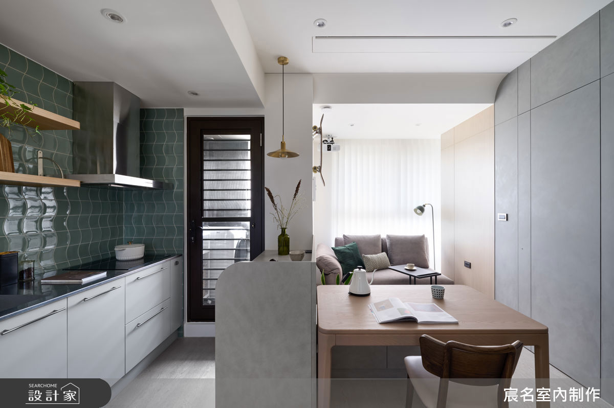 開放式廚房以精心挑選的翠綠色西班牙進口特殊磁磚鋪陳牆面,為空間注入清新層次;搭配溫潤木質層架,兼具展示與收納機能,使料理檯面在實用之餘更顯美感。另一側低檯度櫃體作為備料區的延伸,下方餘裕巧妙規劃收納機能,即便坪數有限,仍透過細緻設計展現小而精巧、機能齊備的理想廚房樣貌。