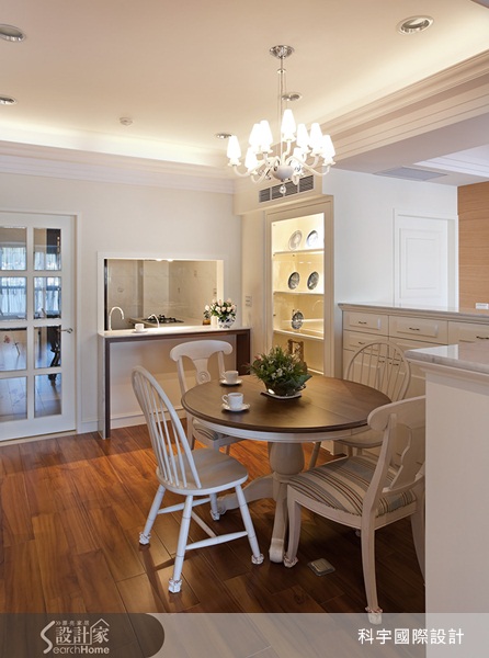 在公共區域方面,為了讓空間感盡量開闊,此處開放式的空間設計藉由結合電視牆與收納櫃的矮牆區隔客廳與餐廳的空間,結合古典語彙的櫃體,可以呼應空間風格的調性,同時多面向的機能設計,也豐富了收納機能。