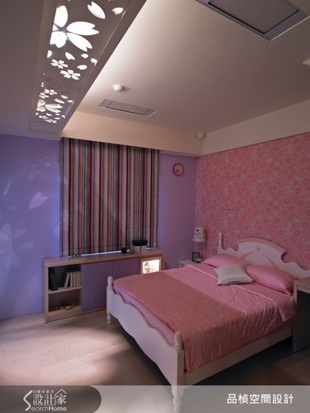 為了彰顯粉色女孩房的甜蜜氣質,除了可愛的花朵圖樣壁紙和寢具設計之外,就連床頭燈罩的選擇也不馬虎;以略帶童趣的紅色彩繪圖樣,延續空間的粉色系,搭配特殊的造型天花照明,成功於光影間創造專屬女孩兒的瑰麗夢境。