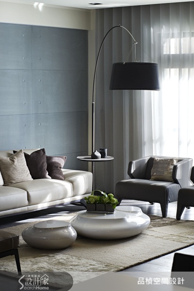 休閒感十足的的客廳中,以大面開窗引入明亮日光,搭配沙發後方那抹自然低調的清水模感牆,再畫龍點睛地配上一盞結合茶几造型的灰色立燈,既統一整體色調,也在實用之餘為空間添入不一樣的視覺效果。