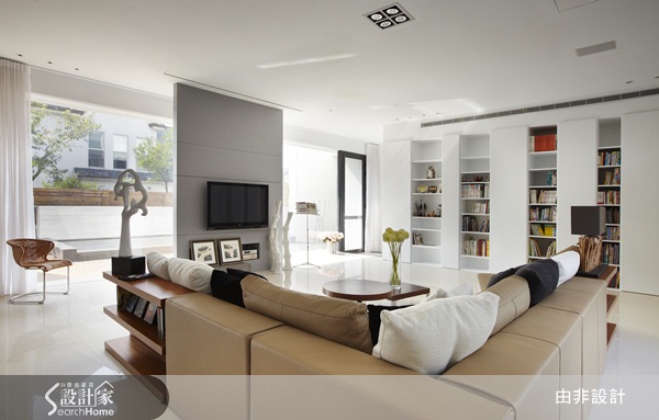 客廳空間採取大面積落地窗設計引入自然光線,而電視牆的位置正好成為客廳端景,且電視牆還具有旋轉功能,可以轉向庭院,讓使用者在庭院游泳池畔休憩時也可欣賞電視。