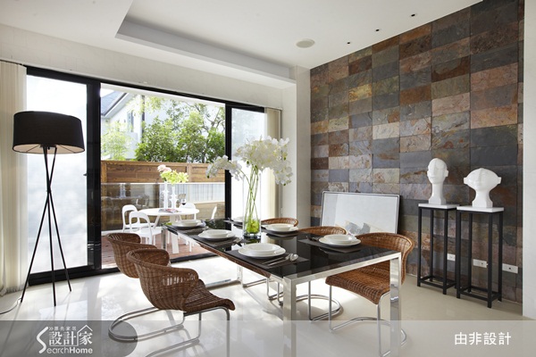 餐廳區域的主牆面以各種不同紋路的石材構築而成,在質樸的自然質感裡展現不同凡響的設計美感。