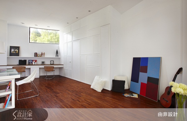 工作書房以木材鋪陳地板,營造舒適自在的生活空間。白色的收納櫃以方塊組合而成,恰好與一旁所放置的畫作相映成趣。