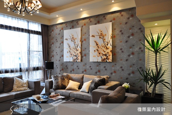 客廳空間帶有新古典及 ArtDeco 語彙,主牆利用線條呈現流暢簡約效果,並賦予細膩的實用機能及美式居家人文藝術情懷,空間也帶有如南洋度假飯店的休閒氣息。