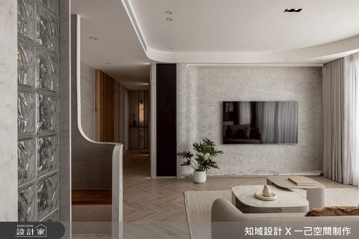 推開家門,玄關處以沉穩的石材與木質拉開序幕,展現內斂的第一印象。為了破解開門見山的隱私疑慮,設計師巧妙運用玻璃磚屏風,其透光不透影的特性,成功將採光延續至落塵區。考量到家中長輩與小孩的進出需求,玄關區特別規劃了一道銜接圓弧矮牆的長型穿鞋椅,牆面噴塗質感細膩的特殊塗料,搭配簡約造型壁燈與展示層板,構築出一抹舒心且具功能性的回家端景。這道弧線不僅指引了進入公領域的方向,更在視覺上預告了全室柔和流暢的設計邏輯。走入客廳,地面鋪設的魚骨拼木地板向窗外採光面延伸,無形中擴張了空間尺度;天花板大膽採用弧型曲面修飾大樑,鑲嵌線性燈帶弱化結構銜接處,營造出向上挑高的層次感。電視主牆以特殊漆與大板磚鋪陳,搭配低矮的家具配置,壓低量體以換取極致寬廣的視野;後方餐廳區則是家人互動的核心,雕塑感強烈的石紋桌板餐桌與懸空光軌吊燈,為三代同堂的用餐時刻增添優雅儀式感;備餐櫃設計則呼應了玄關素材,加入大板磚與玻璃磚元素,在燈影投射下,讓公領域在乾淨俐落中不失精緻細節。