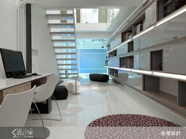 在各種開放式櫃體當中,書櫃是極為常見的一種。一般的書櫃總是方方正正,給人嚴肅的印象。設計師動用巧思,讓垂直面的隔板形成傾斜變化,整個書櫃的造型便變得活潑許多,為空間帶來獨特的設計感。