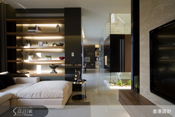 嚮往精品櫥窗式的展示櫃體嗎?其實秘訣很簡單,在展示櫃上增加燈光投射,設計感立即加分!例如本案展示櫃體是以木材搭配黑鏡材質打造而成,加上金黃色的燈光投射,讓櫃體的層次感變得更豐富了。
