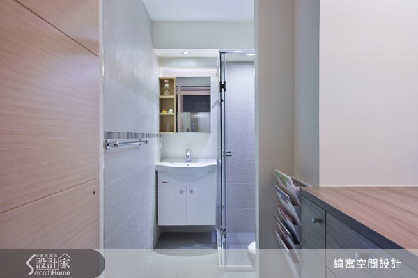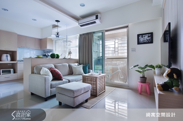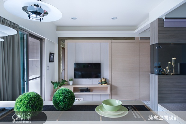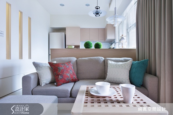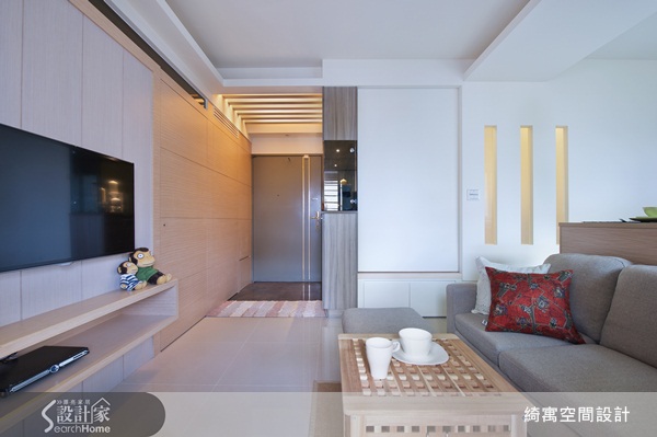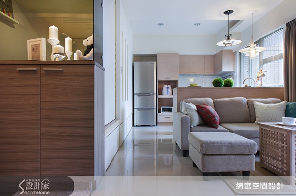 經常在世界各地旅行的屋主,希望家的感覺是慢活、放鬆的,這樣的生活十分愜意,也是屋主的中心思想;因此,綺寓空間設計將主要公共空間以開放方式規劃,展現小坪數難得的開闊居家尺度,空間動線自在流暢沒有阻礙及距離,也呈現出減壓舒適的渡假氣氛。從玄關進來的地坪,設計師便運用與對應空間的白,以深色磁磚表現沉穩冷靜的氛圍,並在與客廳的交界區域中段使用地毯做為過度區隔,除了明顯界定空間使用屬性,也提供入內室內拖的擺放區域。
