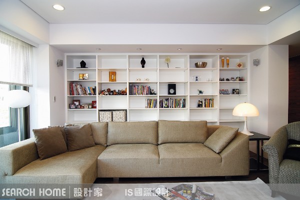若是覺得客廳空間太過單調,不妨考慮將其中一面牆面改造為展示櫃,不但能夠增加展示收納機能,同時也能讓空間視覺層次更加多元。例如本案以沙發背牆結合展示櫃設計,既實用又好看。