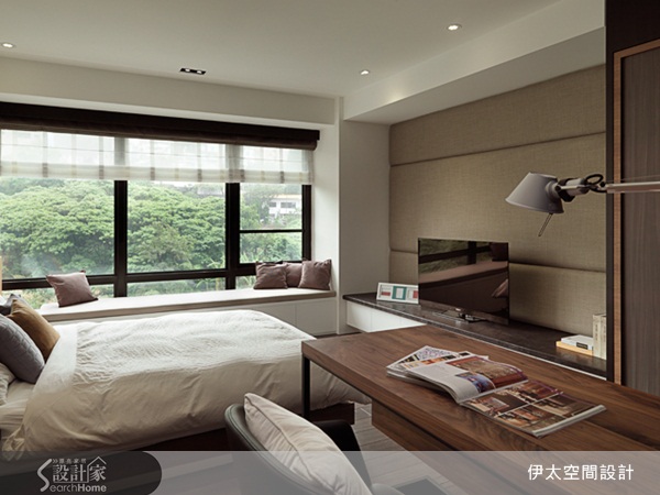 為了提升臥室空間的舒適感,設計師選用繃布材質打造臥室電視主牆,不但在視覺上能給予人柔軟溫和的感受,同時布料材質也有助於吸收噪音,讓空間感更為寧靜。