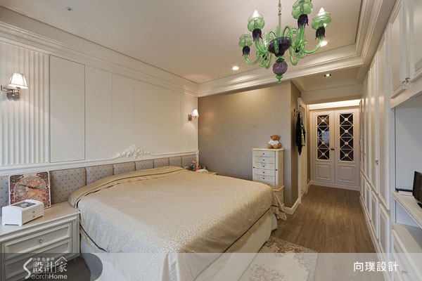 以白色系為主的主臥空間,巧思配入一盞女屋主自國外購回的吊燈,跳色出名明亮的視覺焦點。