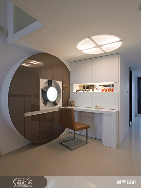 運用櫃體造型結合收納等機能設計,是常見的牆面設計手法之一。本案在餐廳空間牆面設置一圓型鏡櫃,特殊的幾何造型以及鏡面的反射效果讓空間顯得明亮開闊,同時又為空間增添了收納機能。