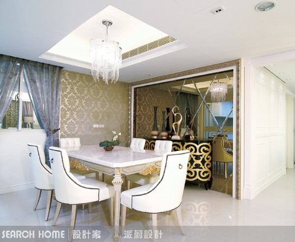 在餐廳牆面搭配較為華麗的金色壁紙,使開放式的餐廳區域因為壁紙而定義出區域範圍。