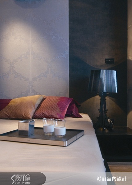 捨棄一般床頭板,改以壁紙妝飾床頭牆面,並以素面與花色壁紙雙色搭配出變化層次。