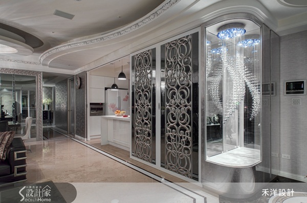 為了讓空間感更富有高雅氣質,設計師利用鏡面作為端景設計的基底,搭配白鐵件雕花來創造細膩雕琢的設計感,而鐵件與鏡面兩種明亮的材質相互對話,更為空間帶來 bling-bling 的奢華調性。