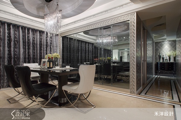 設計師將餐廳空間的主牆面設計為整面櫃體,並且將中間局部空出,鑲入菱形鏤刻鏡面,讓整面櫃體有如一大型畫框般,投映著空間奢華高貴的美感;而菱形鏤刻處理鏡面的方式,更令人感到設計者的細膩與用心。