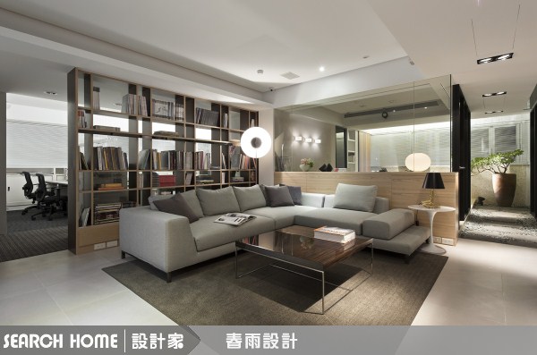 客廳與書房之間採取雙面書櫃作為隔間量體,不但符合書房的藏書需求,同時也讓書牆成為客廳中的獨特風景,讓空間充滿清爽而優雅的書香氣息,並且保留了視覺上的穿透效果。