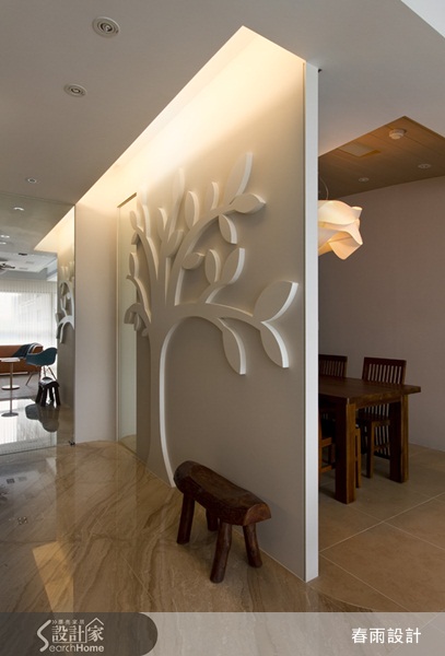 設計師在客廳與餐廳之間設置一道浮雕藝術牆面,呼應空間的自然生活態度,以造型簡約大方的大樹意象為主題,並且在牆邊擺上一張小木凳,讓人彷彿來到鄉間的榕樹下,使家居空間回歸任真純樸的人文美學。