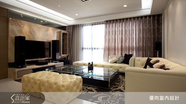 大理石電視主牆提升了空間質感,釘扣沙發點出新古典風格的味道。