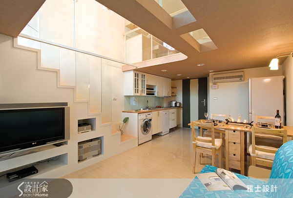 進入了家門,有開放式廚房可以自行烹調,有烘衣機可以處理衣物,坐在餐桌上吃一頓晚餐,客廳旁邊還能一邊彈鋼琴,讓無隔間開放式居家成為新生活潮流,上下兩層合併只有 17 坪,卻同樣能招待朋友的幸福居家。