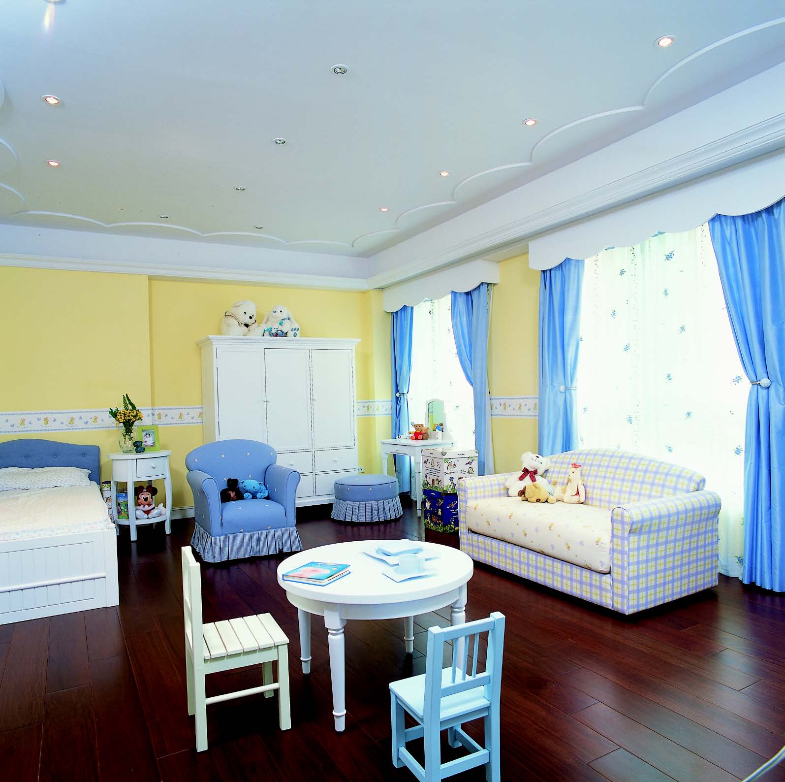 為了寶貝女兒房間的設計,女屋主花了許多心思,給小孩寬敞的活動空間,又應該如何安排空間的規劃?為了讓小孩有自己專屬空間的安全感,屋主請其可設計師特別為小孩訂做符合身高與尺寸的「迷你版」傢具,包括了雙人沙發、單椅、腳凳、餐桌與小餐椅,讓小孩可以與其他朋友一同在臥房內扮家家酒、看書、畫畫等。