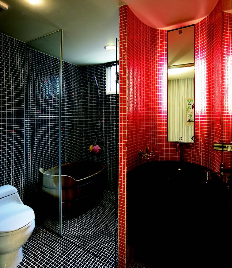 家裡空間較大,小朋友可以分到屬於自己的浴室,應該如何打造?許多家長考量使用的長效性,都不喜歡將浴室規劃的太過於可愛,設計師建議應該從好清潔的材質著手,運用黑色與紅色馬賽克磚,清楚區分不同使用空間,檜木桶是不想裝設傳統浴缸的替代選擇,也適合較小的浴室空間使用,規劃乾溼分離也讓浴室更好打掃。
