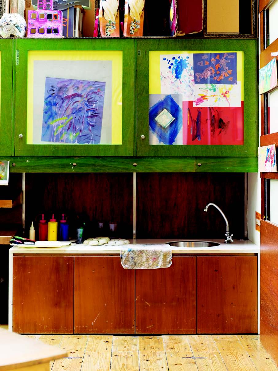這是「童年空間」專門為小朋友規劃的兒童勞作區,洗手台高度約 50 公分,讓小朋友可以自己轉開水龍頭,調色盤與顏料就放在旁邊,還有小抹布方便清理,小朋友可以隨心所欲地在這裡做勞作、畫畫,弄髒了也不擔心。
