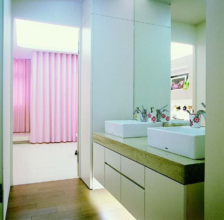 提供兩個小孩使用的浴室,建議規劃雙面盆,讓兩人能夠同步作息,不會影響對方,寬敞的洗手台可以有各自的區域,也是養成手足之間相互體諒、一同分享空間的學習過程。