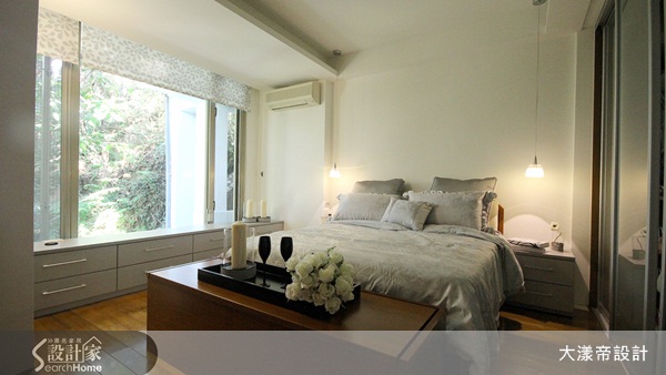主臥延續公共空間的木質感,淡雅的寢具搭配窗外綠蔭,打造全然放鬆的睡眠情境。