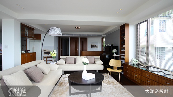 將一半以上的預算都花在基礎工程的重整,其餘空間則以簡單、俐落的線條為主,並善用大面落地開窗讓三面採光的絕佳視野,成為空間最迷人的背景元素。同時,考慮舊有的木工裝潢仍可使用,戴銘泉於是與屋主討論,直接採取表面重新刮磨、上漆方式,替代大量實木貼皮,並沿用舊有沙發,重新繃上米色布料外包,配上一只深色木茶几和毛料地毯,共構溫馨、舒適的客廳場景。