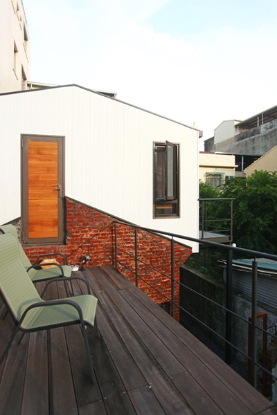 第三間房間改為中庭,區分出交誼區和住宿區,鋪上小碎石,從旋轉樓梯走上陽台,令人意想不到的創新設計。